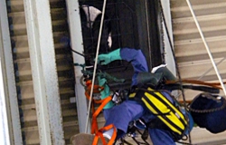 安全性に優れたレスキュー隊の装備を使用することにより、天井などの高所でもロープ使用で作業を行います。